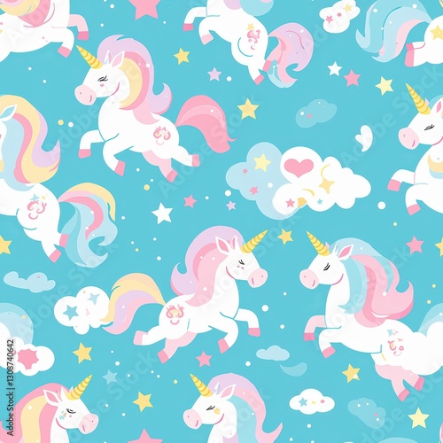 A whimsical and enchanting seamless pattern featuring graceful unicorns with pastel-colored manes, fluffy clouds, twinkling stars,