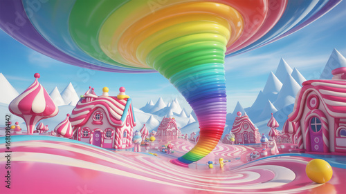 A whimsical candy land with a rainbow tornado swirling above colorful houses, creating a sweet and imaginative fantasy landscape