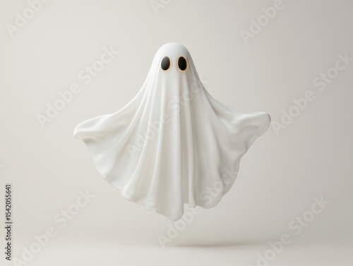 A whimsical ghost floating in the air, it features simple, yet impactful design with black eyes and a flowing white sheet. The ghost emanates a sense of playfulness and mystery