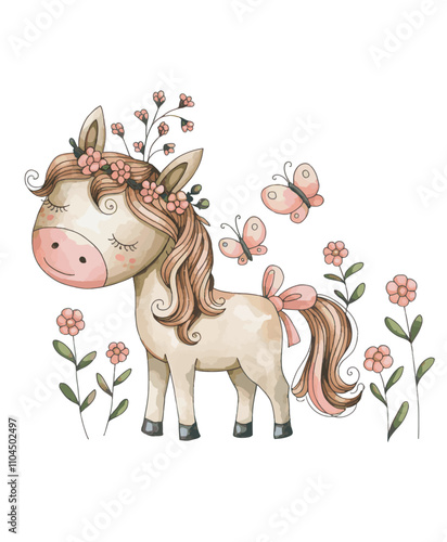 A whimsical, hand-drawn illustration of a horse. The horse has a light brown coat, wavy mane, and a floral crown adorned with pink flowers