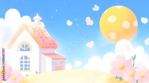 A whimsical landscape featuring a charming house, flowers, and a bright sunny sky.