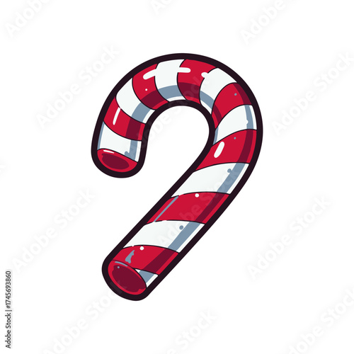 A whimsical red and white candy cane, showcasing its curved shape against a white background, ideal for holiday themes