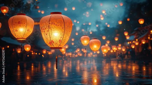 A whimsical scene of colorful paper lanterns floating gently in the night sky, illuminated from within and creating a magical and festive atmosphere