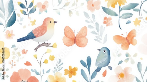 A whimsical watercolor animal pattern with cute hand-painted birds, butterflies, and flowers
