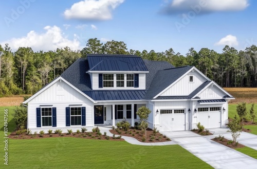 a white and navy blue modern farmhouse-style home with a shingle roof, a large front yard, and an aerial view
