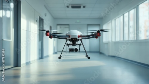 drone, flying, camera, indoor, corridor, hallway, hospital, office, building, white, red, technology, aircraft, futuristic, modern, machine, contraption, device, apparatus, equipment, instrument, tool, engineering, innovation, invention, automation, surveillance, monitoring, inspection, security, safety, flight, aerial, photo, videography, interior, architecture, space, room, window, door, floor, wall, light, bright, clean, sterile, empty