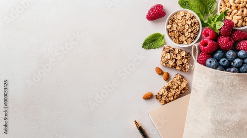 A white background with a basket of food and a pen. The basket contains a variety of food items such as nuts, berries, and granola. The pen is placed on the table next to the basket