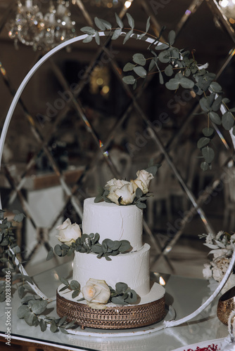 A white cake with two layers and a green leaf on top. The cake is placed on a gold tray and is surrounded by greenery