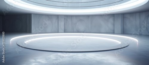 A white circular room with a glossy circular ceiling, giving off a modern and abstract architectural background. The room is illuminated by neon lighting, creating a sleek and futuristic ambiance.