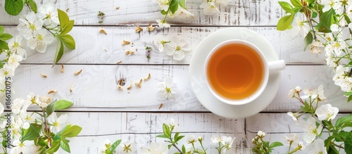 A white cup of hot herbal tea surrounded by spring flowers on a light wooden background creates a serene lifestyle image with copy space.