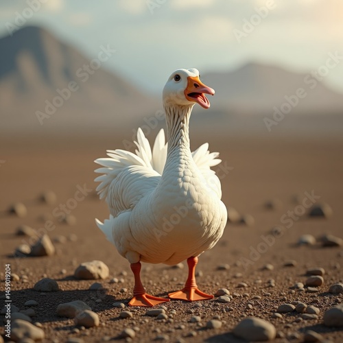 A white duck with orange beak and feet standing on a rocky surface in front of mountains