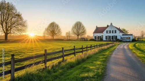 farmhouse, sunset, sunrise, house, home, rural, field, meadow, grass, green, tree, sky, cloud, sun, light, golden hour, dusk, dawn, nature, landscape, country, drive, road, path, fence, wooden, wooden fence, farm, country life, countryside, calmness, peace, serenity, beauty, peaceful, idylli, rustic, charming, calm, outdoors, nature scene