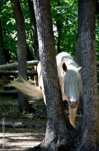 horse, white, hiding, standing, playing, tree, funny, crafted, intelligent, mammal