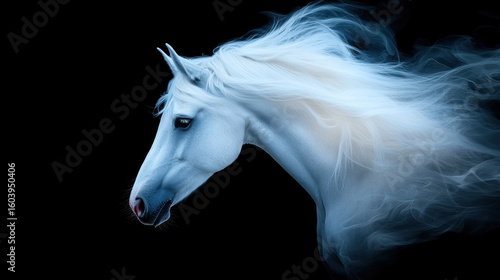 horse, mane, tail, profile, majestic, white, view, stark, black, background, head, long, nose, light, pink, colours, eye, dark, mouth, open, teeth, visible, text, object, white horse, black background, light pink