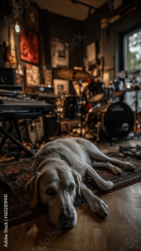 labrador, dog, music, studio, rug, instrument, relaxed, cosy, decor, natural, light, wooden, floor, animal, pet, ambience, creative, space, home, art, sound, leisure, playful, canino, atmosphere, drum, set, keyboard, comfort, delightful, warm, peaceful, cute, friendship, joyful, melodic, lifestyle, homelike, relaxing, casual attire