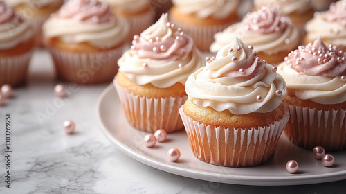 A white marble table holds a plate of cupcakes with smooth white icing, delicately sprinkled with small pearl balls. The modern setting exudes elegance, purity, and minimalistic sophistication.