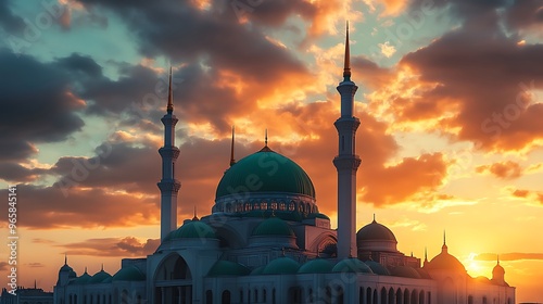 mosque, minaret, dome, sunset, cloud, sky, orange, white, green, shadow, architecture, islam, religious, faith, worship, spirituality, beautiful, peaceful, majestic, golden hour, city landscape, travel, landmark, destination, culture, tradition, history