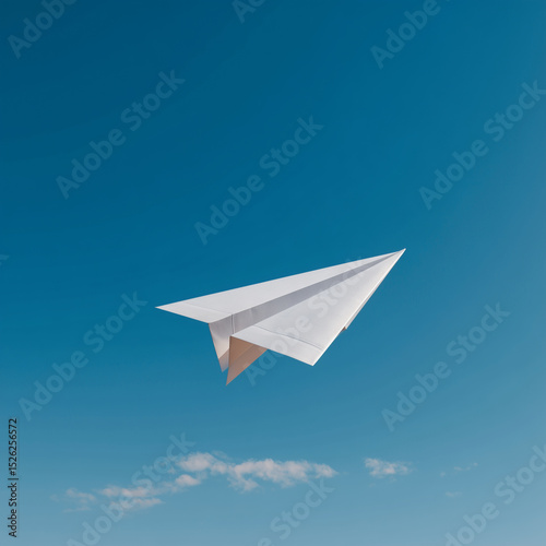 A white paper airplane flying in a bright blue sky with a few small white clouds at the bottom corner