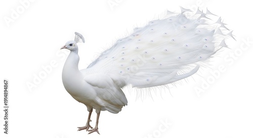 A white peacock standing with its colorful tail feathers spread out on a plain white background.