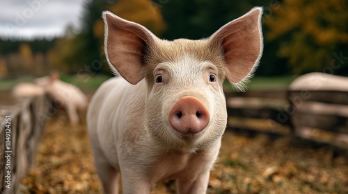 A white pig with pink ears and a pink nose is standing in a pen with other pigs. The pig is looking at the camera with a curious expression