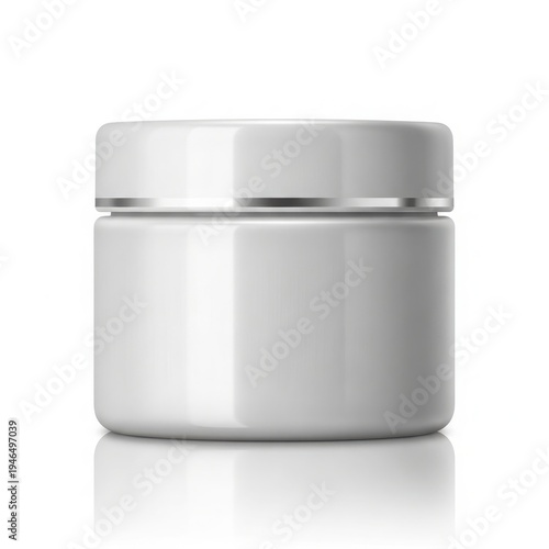 A white plastic jar with a silver lid on a reflective surface isolated on white background