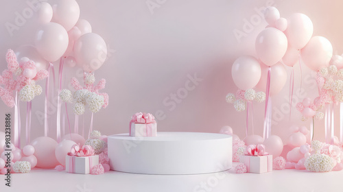 white, dais, soft, floral, decoration, surrounded, pastel, balloon, gift, box, pink, ribbon, set, gradient, background, day, celebration