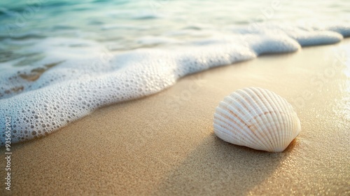 A white seashell resting on a sandy beach, symbolizing the calmness of the ocean
