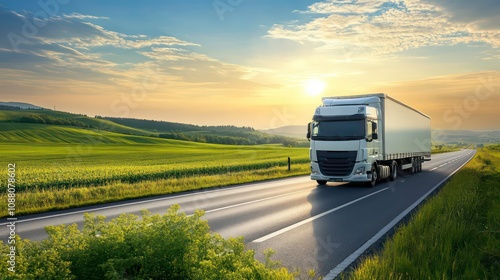 truck, transportation, delivery, cargo, logistic, highway, road, drive, driving, transport, vehicle, commercial, shipping, freight, road trip, travel, sunset, sunrise, landscape, nature, hill, field, grass, green, blue, sky, sun, summer, horizon, asphalt, countryside, rural, daytime, outdoors, distance, motion, fast, speed, movement, journey, destination, direction, open, wide, freedom, adventure, route, scenic, semi