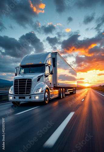 semi, truck, white, trailer, road, us, sunset, dramatic, cargo, sleek, modern, design, driving, large, vehicle, transportation, logistic, enclosed, freight, highway, horizon, delivery, journey, asphalt, orange, sky, travel, commerce, professional, trucking, hauling, industrial, scenery, automotive, powerful, wheel, shipment, scenic, transport, dusk, lorry, car, industry, shipping, van, business, speed, tanker