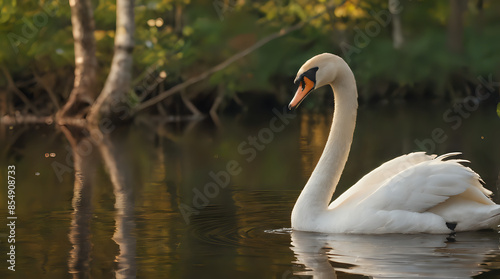 a white swan swimming in the water near a forest