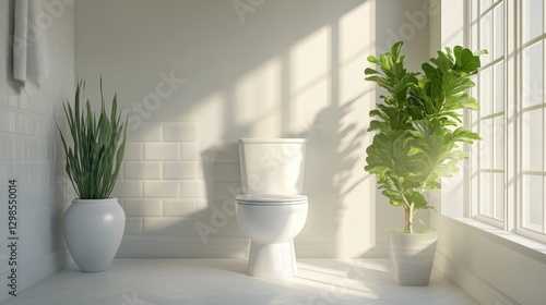 A white toilet in a bright and airy bathroom, with a minimalist design, neutral tiles, and gentle lighting creating a serene environment.