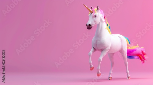 A white unicorn with a rainbow mane and tail stands on a pink background.