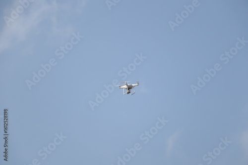 A white unmanned aerial vehicle with a camera flying in the blue sky.