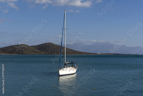 A white yacht moored on the Merabello Gulf at Elounda, northern Crete, Greece,