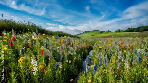 A wide green meadow bursting with wildflowers of different colors, swaying gently in the breeze.