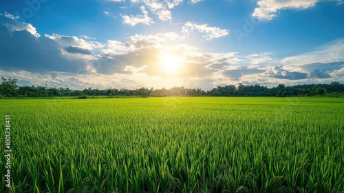 nature, field, green, rice, paddy, sun, sunset, sky, cloud, agriculture, rural, landscape, horizon, growth, harvest, farmland, outdoors, sunshine, bright, gold, summer, scenic, tranquil, beauty, vibrant, peaceful, serenity, meadow, huge, expansive, natural, fresh, organic, environment, ecology, ecosystem, plant, vegetation, countryside, wilderness