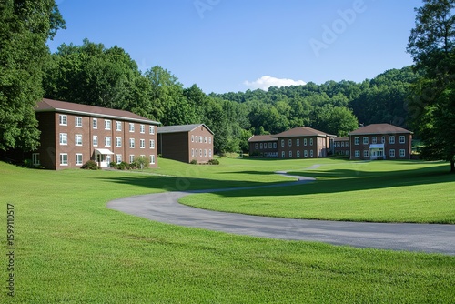 A wide-angle view of the exterior front facade, with green grass and modern architecture, of an elementary school in West Virginia that has brown brick walls and white trim
