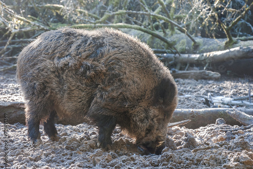 A wild boar digs through the mud in front of a fallen spruce tree, silhouetted by the morning backlight. Its imposing tusks stand out sharply, capturing a rugged image of nature in its untamed beauty.