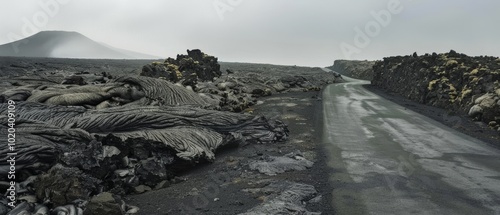 A winding asphalt road cuts through a vast, stark volcanic plain with distant mountains, symbolizing the interplay between manmade and natural wonders.