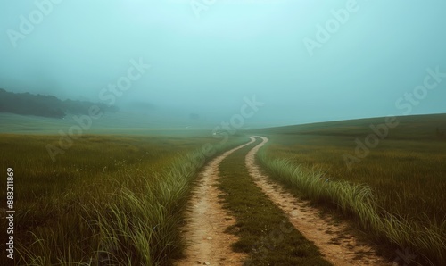 winding road, dirt road, meadow, foggy, horizon, grass, landscape, nature, calmness, serene, path, trail, countryside, rural, mist, overcast, field, greenery, scenery, journey, vegetation, travel, peaceful, morning, vista, environment, solitude, quiet, road, sky, country, summer, green, cloud, cloud, way, tree, dirt, land, track, agriculture, hill, sun, farm