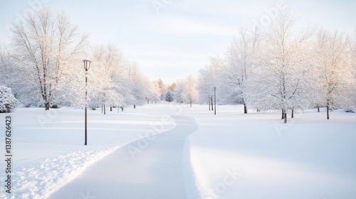 A winding path covered in fresh snow through a serene winter forest, tall trees with snow-laden branches, and peaceful and tranquil setting.