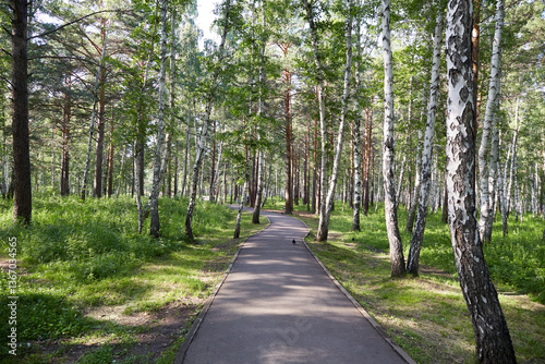 A winding path in a quiet park with tall birch trees. A cozy place to relax from the hustle and bustle of the city on a summer day.