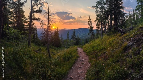 sunset, mountain, forest, path, tree, nature, landscape, wilderness, trail, hiking, adventure, scenic, beauty, sky, cloud, horizon, golden hour, tranquil, peaceful, serenity, summer, green, grass, pine, foliage, view, vista, panorama, travel, exploration, remote, wild, natural, environment, rural, geology, rock, dirt, ground, earth