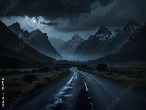 A winding road, shrouded in mist, stretches through a valley surrounded by towering, ominous mountains, their rugged peaks reaching towards the dark, foreboding sky, with subtle hints of moonlight
