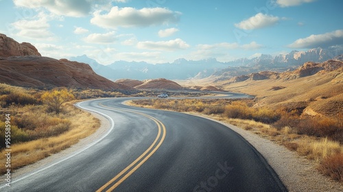 A winding road through a scenic landscape with a road trip vehicle in the distance, showcasing the journey ahead. Ample space for text.