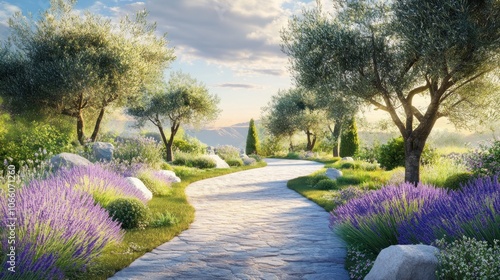 A winding stone path leads through a serene landscape of olive trees, lavender bushes, and rolling hills under a clear sky.