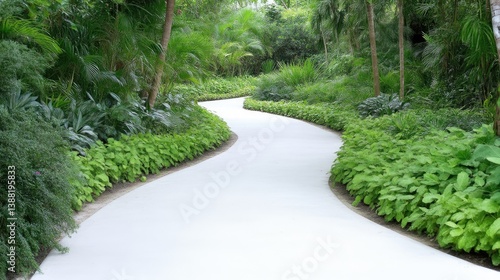 A winding white path meanders through lush green landscaping. The path is smooth and bright, bordered by vibrant, low-lying plants. The image is well-lit, exhibiting high quality. Its serene style