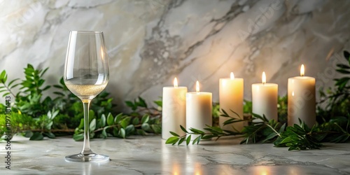 A wine glass on a marble surface surrounded by candles and greenery, wine and cheese, centerpiece