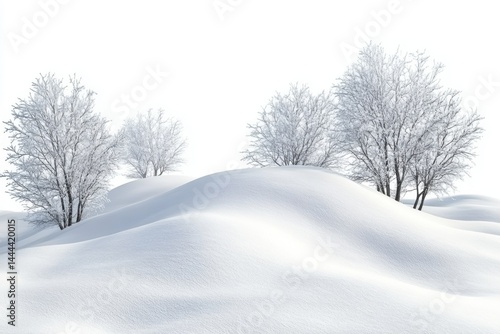 A winter scene with snow covered hills and trees against a bright white background in daylight