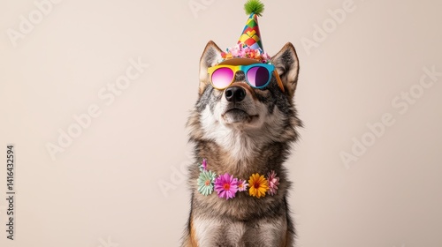A wolf wearing a party hat, colorful sunglasses, and a flower necklace, looking up, in front of a light background, balanced composition with ample copy space for text